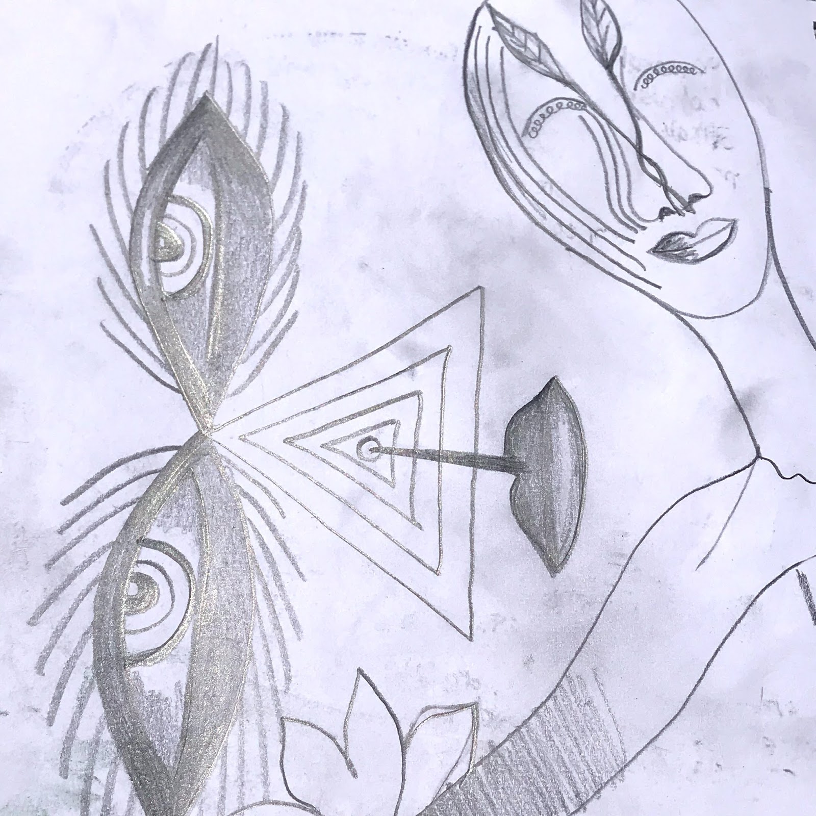 I am a jade plant, a mystic feather, a four leaf clover, a amethyst crystal, the cosmic wheel of Buddha, Rose written in Arabic and the mantras of protection and wisdom.